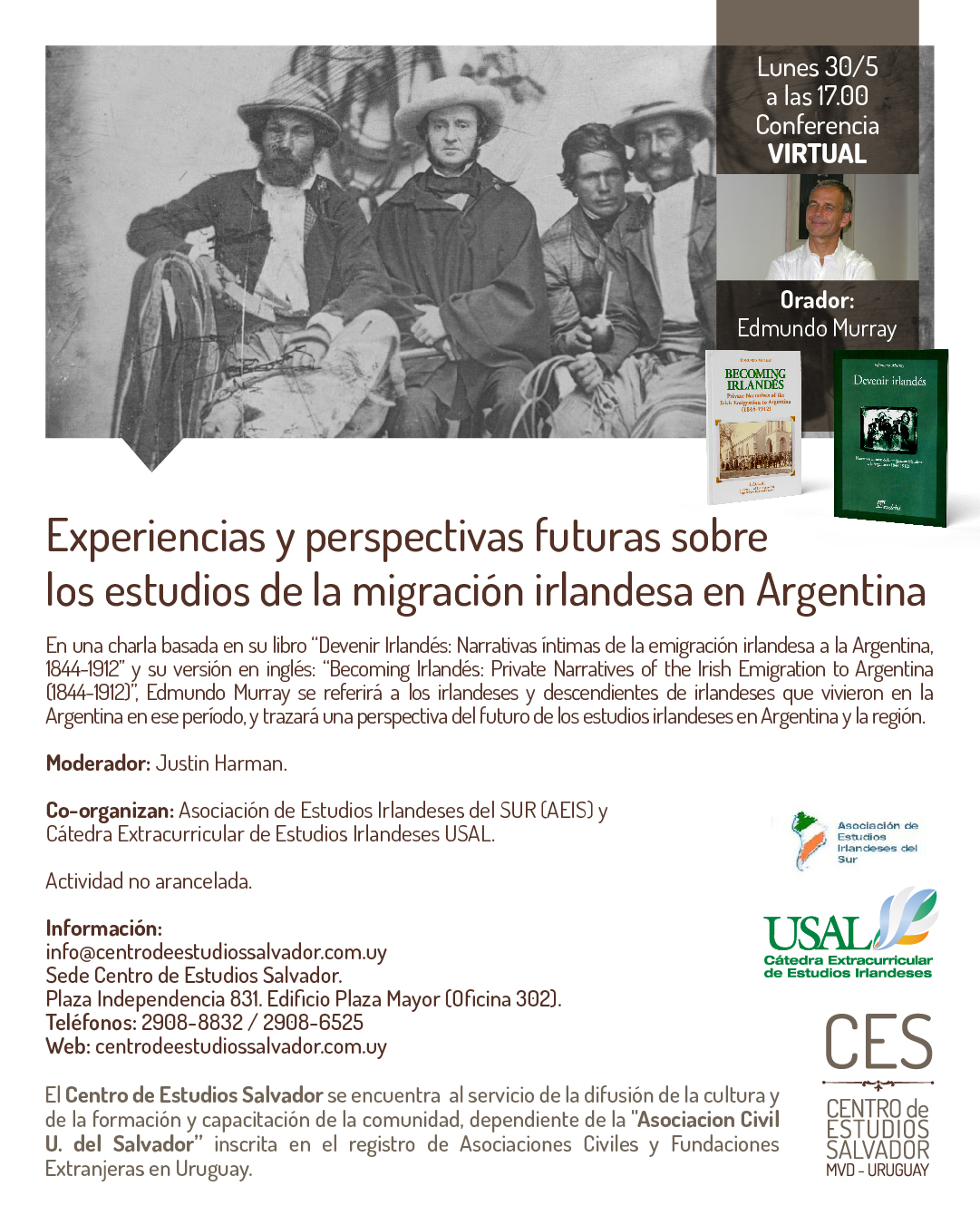 En una conversación basada en su libro Devenir Irlandés: Narrativas íntimas de la emigración irlandesa a la Argentina, 1844-1912 y su versión en inglés: Becoming Irlandés: Private Narratives of the Irish Emigration to Argentina (1844-1912), Edmundo Murray se referirá a los irlandeses y descendientes de irlandeses que vivieron en la Argentina en ese período, y trazará una perspectiva del futuro de los estudios irlandeses en Argentina y la región.